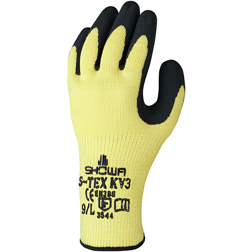 ステンレスワイヤー糸とケブラーを採用し、手のひらに天然ゴムをコーティングした耐切創性背抜き手袋