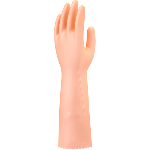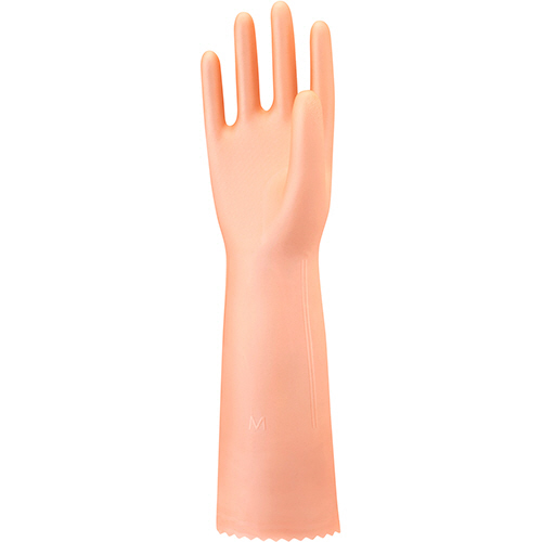 ●手袋の厚みと裏毛のバランスを工夫し、やさしいフィット感に仕上げたMサイズの塩化ビニール製手袋、色はパールオレンジです。