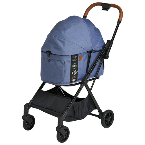 ●ハンドルのボタンを押すだけで、サッと自動で折りたたむことができる、画期的なオートクローズのペットカート。色はブルーノートです。