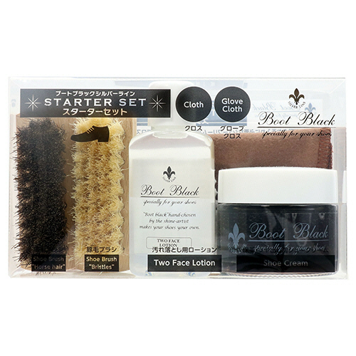 ●セット内容/ブートブラック シルバーライン シュークリーム(ブラック30g)×1、ブートブラック シルバーライン ツーフェイスローション(30mL)×1、馬毛ブラシ×1、豚毛ブラシ×1、クロス×1、グローブクロス×1