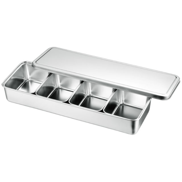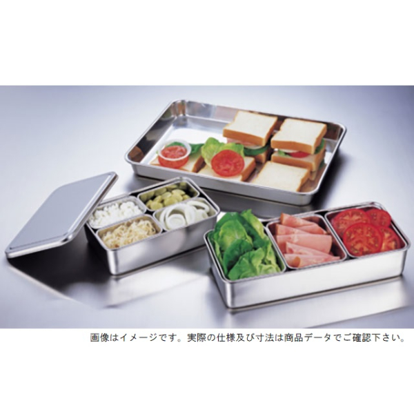 蓋と小分けのバットがセットになっている調味料入バット。調味料や具材を小分けに整理でき便利。蓋付きで衛生的にお使い頂けます。調味料等の補充や洗浄の際は小分けのバットを取り出せるので、お手入れラクラク。サイズ:(バット寸法)432×148×63mm材質:SUS304(18-8ステンレス)、[蓋]21-0(SUS443J1)(バット寸法)432×148×63mm