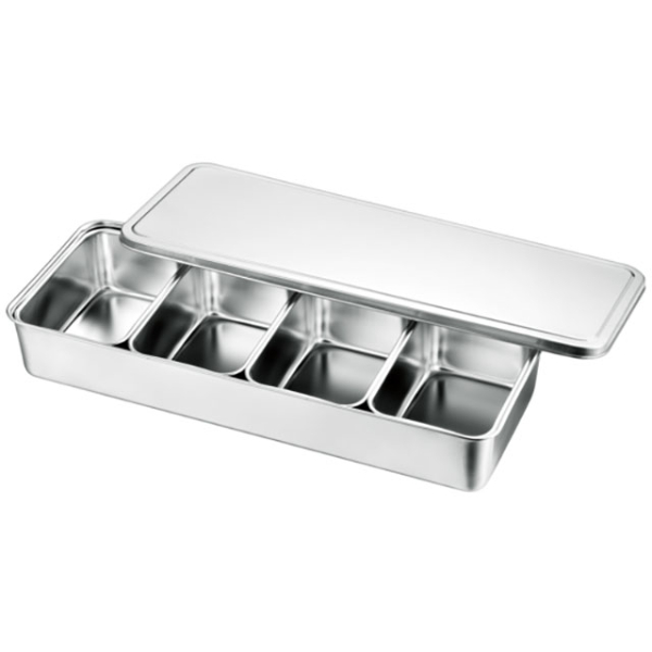 蓋と小分けのバットがセットになっている調味料入バット。調味料や具材を小分けに整理でき便利。蓋付きで衛生的にお使い頂けます。調味料等の補充や洗浄の際は小分けのバットを取り出せるので、お手入れラクラク。サイズ:(バット寸法)454×174×72mm材質:SUS304(18-8ステンレス)、[蓋]21-0(SUS443J1)(バット寸法)454×174×72mm