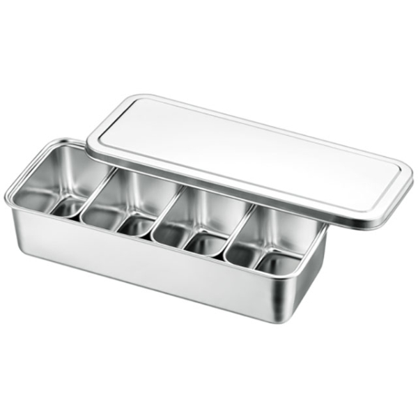 蓋と小分けのバットがセットになっている調味料入バット。調味料や具材を小分けに整理でき便利。蓋付きで衛生的にお使い頂けます。調味料等の補充や洗浄の際は小分けのバットを取り出せるので、お手入れラクラク。サイズ:(バット寸法)281×118×63mm材質:SUS304(18-8ステンレス)、[蓋]21-0(SUS443J1)(バット寸法)281×118×63mm