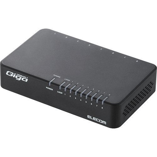●音が静かなファンレス設計で、ループ検知機能も搭載した1000BASE-T対応の電源外付けプラスチック筐体8ポートハブ、本体色はブラックです。