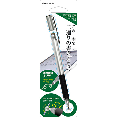 ●1本で「透明なディスク型ペン先」と「導電繊維のペン先」を用途に合わせて選べるタッチペン、本体カラーはシルバーです。