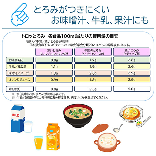 お茶だけでなく、乳製品、味噌汁等にとろみがつきやすいプロ仕様