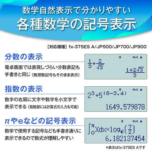 ●機能/394関数・機能(単位換算200)、微分積分、複素数計算、統計計算、n進計算、数学自然表示入力対応、エラー位置表示、連続演算機能、オートパワーオフ