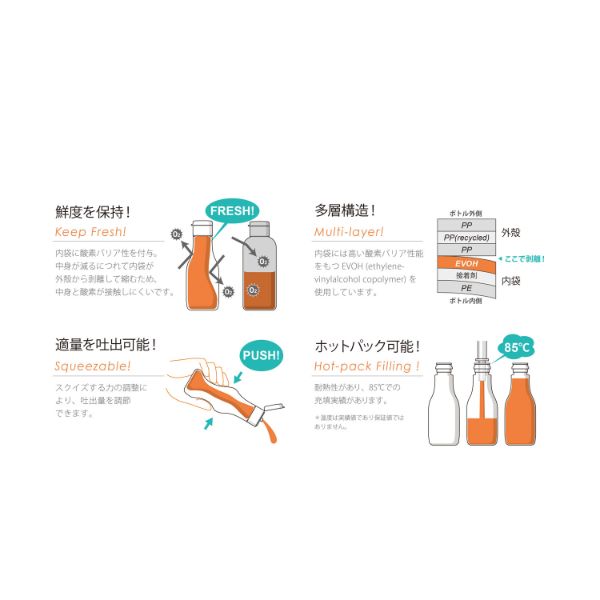 中身と空気の接触を減らし、開封後の鮮度保持力を高めた画期的な二重構造剥離ボトルです。[鮮度保持]内袋がバリア性を持つため、開封後の内容物の長期的な鮮度保持が可能(PET・ビン比較)。[残量低減]内容物の減少と共に内袋が縮むため、残量低減が可能。[耐熱]85℃。[サイズ展開]100、200、360、450ml。醤油や健康オイルなど多数実績あり。※キャップは別売り。※蓋嵌合時、専用の打栓機が必要です。