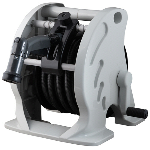 ●ホースの巻き取りがスムーズなホースガイド付きの散水ホースリール、チャコールグレーのホース長さは20mです。