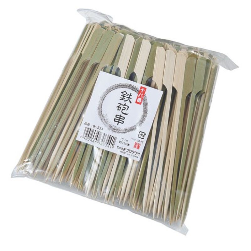 鉄砲のような形状から名付けられた串です。持ちやすいので焼き物から和菓子まで幅広く対応します。[品番]110160。サイズ:全長120×10×4×厚3mm材質:竹材120×10×4mm