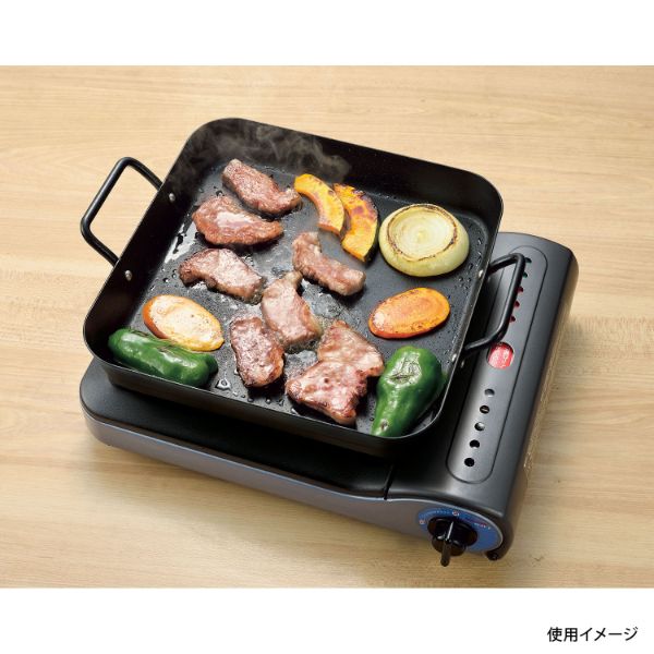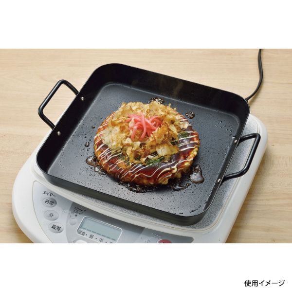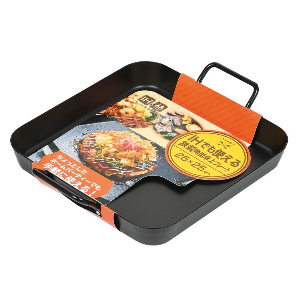 卓上コンロでも、ガスコンロでも、IHでも。ちょっとしたパーティーでも手軽に使える!オール熱源対応。電子レンジ不可。食器洗い乾燥機不可。[生産国]中国。サイズ:寸法25×25cm、[製品サイズ](約)幅31×奥行25.5×高さ5.5cm材質:鉄、[表面加工]シリコーン樹脂加工寸法25×25cm、[製品サイズ](約)幅31×奥行25.5×高さ5.5cm