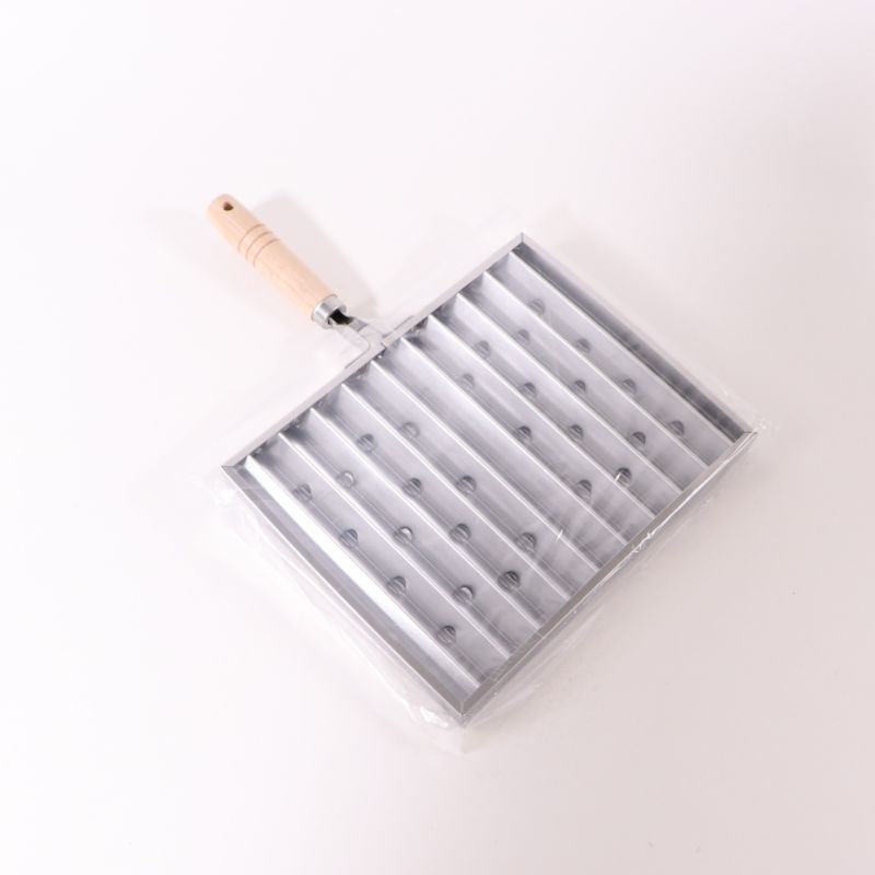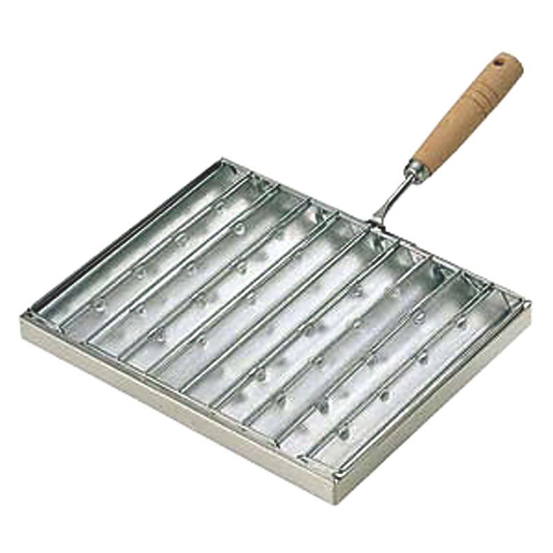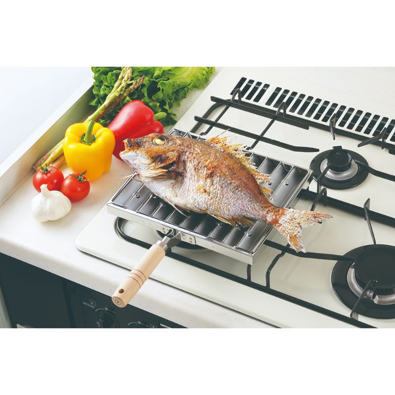 底板がアルスター素材のアコーディオン形状だから遠火効果で表面だけがこげずに身まで良く火が通ります。また、焼いた魚・肉などの油が本体に落ち、直接火にかかりませんので煙が出にくいです。[品番]109057。サイズ:250×200×H25×柄長160mm材質:18-8ステンレス250×200×25mm