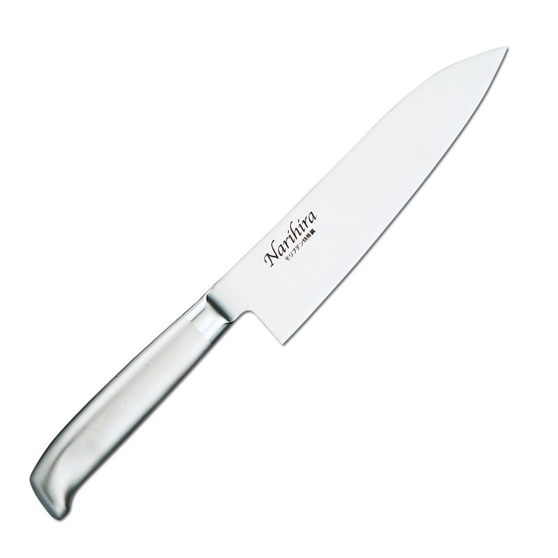 オールステンレス。色分けリング付。リングは取り外しができます。Narihira PROシリーズは、オールステンレスの衛生面と、色分けできる包丁の両方のメリットを両立した全く新しい業務用洋包丁シリーズです。リング部分はシリコンになっており、取り外して包丁全体を洗うこともでき、別売りのリングで色の変更も後から可能。まさにHACCP対応工場や衛生面を重視する店舗様にピッタリの意欲的なシリーズです。