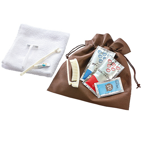 ●セット内容/[タオル]140匁白タオル綿100%(320×800mm)、[歯ブラシ]柄:PP・毛:ナイロン、[歯みがき粉]3g、[カミソリ]PP・全長約100mm、[折りたたみヘアブラシ]PP・全長165mm、[ボディソープ]パウチ10ml、[フェイスウォッシュ]パウチ3g、[リンスインシャンプー]パウチ10ml、[不織布巾着]250×280×マチ80mm