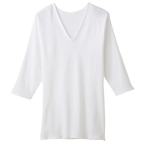 ●良質綿で汗をよく吸う。やわらかく肌ざわりの良いフライス素材のV型七分袖スリーマー。カラーはホワイト、レディースのLLサイズです。