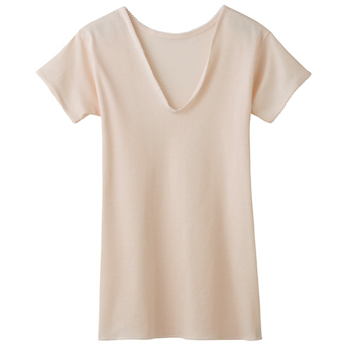 ●良質綿で汗をよく吸う。やわらかく肌ざわりの良いフライス素材のV型三分袖スリーマー。カラーはカームベージュ、レディースのSサイズです。