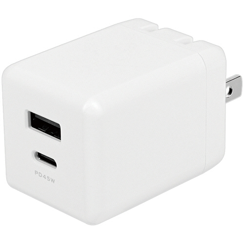 ●窒化ガリウム(GaN)採用でコンパクト。USB Type-C/TYPE-Aコネクタ搭載のAC充電器。色はホワイトです。
