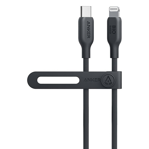 ●強度と耐久性を高めながら環境への配慮を実現したUSB-C-ライトニングケーブル。長さ約0.9mのブラックです。