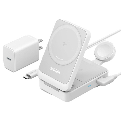 ●マグネット式ワイヤレス充電対応の3-in-1充電器。本体色はホワイトです。