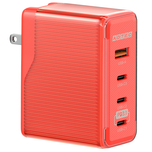 ●「USB Power Delivery EPR」に対応し、140W/28V/5Aの単独出力に加えて、複数ポートでも多彩な出力を実現。USB-C 3ポート、USB-A 1ポートを搭載し、同時に4台の機器を充電可能なPD3.1 150W PD充電器。カラーはレッドです。