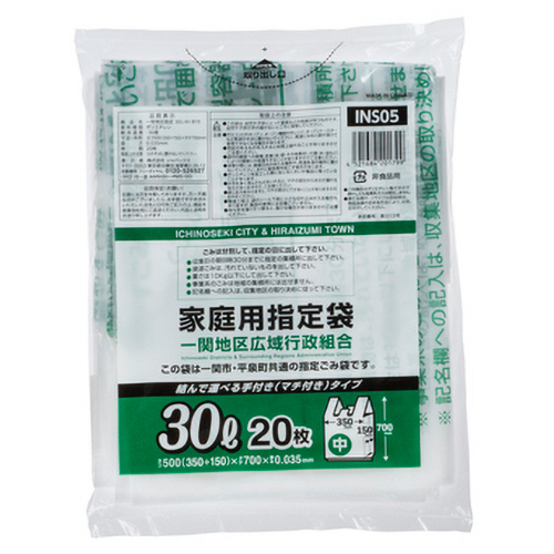 ●一関地区家庭用指定、手付きのごみ袋、30L(中)の20枚入です。