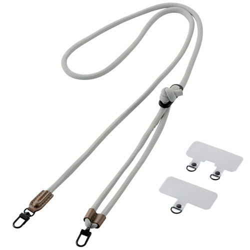 ●肩から掛けられる丸ひも(6mm)タイプのスマホショルダーストラップ。色はライトグレーです。