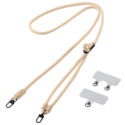 ●肩から掛けられる丸ひも(6mm)タイプのスマホショルダーストラップ。色はベージュです。