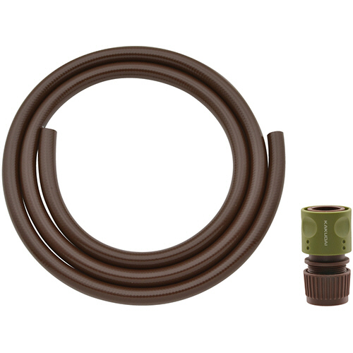 ●1mの散水用ホースと、ホースをつなぐためのジョイント部品(ホーセンド)のセット。色はブラウンです。