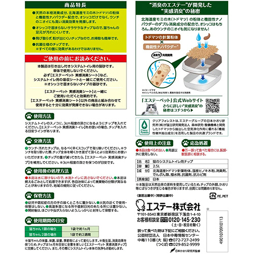 ●天然の本格消臭成分、北海道産モミの木(トドマツ)の粉体と機能性ナノパウダー配合で、オシッコだけでなく、ウンチのニオイにも高い消臭効果を発揮するトイレ用チップ、2.5L入です。