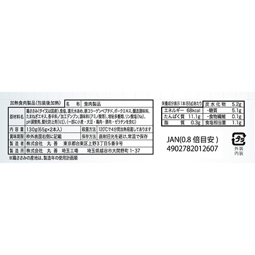 ●原材料/[原材料]鶏ささみ(タイまたは国産)、食塩、還元水あめ、豚コラーゲンペプチド、ポークエキス、醸造調味料、たまねぎエキス、香辛料 [添加物]加工デンプン、調味料(アミノ酸等)、増粘多糖類、リン酸塩(Na)、pH調整剤、酸化防止剤(V.E)、(一部に小麦・大豆・鶏肉・豚肉・ゼラチン