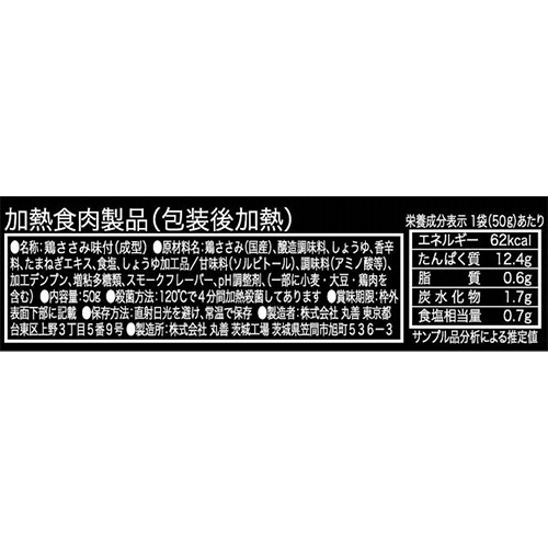 ●原材料/[原材料]鶏ささみ(国産)、醸造調味料、しょうゆ、香辛料、たまねぎエキス、食塩、しょうゆ加工品 [添加物]甘味料(ソルビトール)、調味料(アミノ酸等)、加工デンプン、増粘多糖類、スモークフレーバー、pH調整剤、(一部に小麦・大豆・鶏肉を含む)