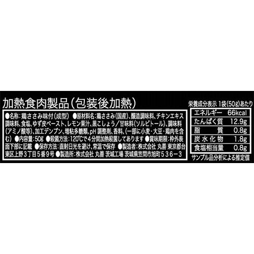 ●原材料/[原材料]鶏ささみ(国産)、醸造調味料、チキンエキス調味料、食塩、ゆず皮ペースト、レモン果汁、黒こしょう [添加物]甘味料(ソルビトール)、調味料(アミノ酸等)、加工デンプン、増粘多糖類、pH調整剤、香料、(一部に小麦・大豆・鶏肉を含む)