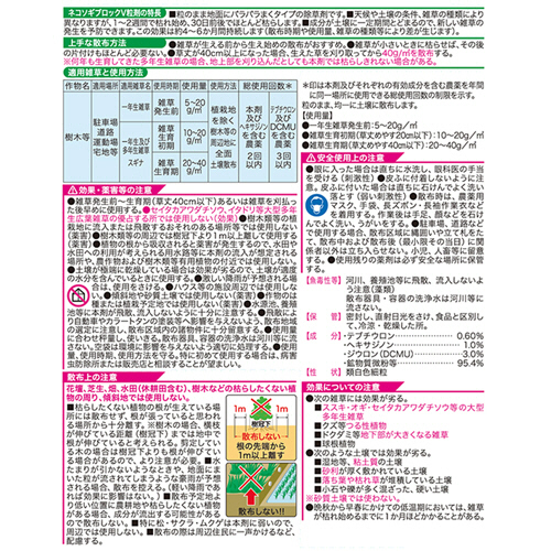 ●雑草が生える前から使え、草丈40cmの雑草も枯らす(20~40g/m2布時)。
