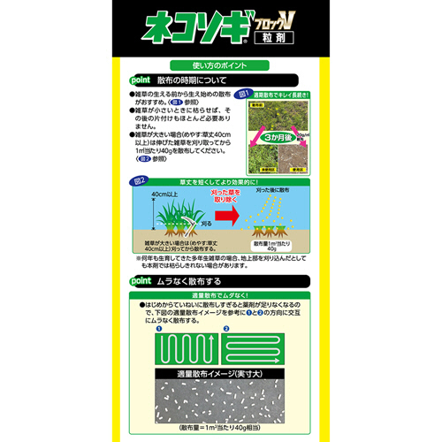 ●雑草が生える前から使え、草丈40cmの雑草も枯らす(20~40g/m2散布時)。