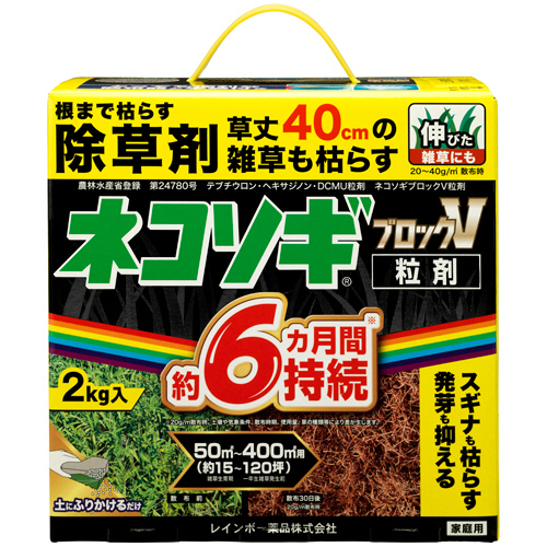 ●雑草が生える前から使え、草丈40cmの雑草も枯らす(20~40g/m2散布時)。