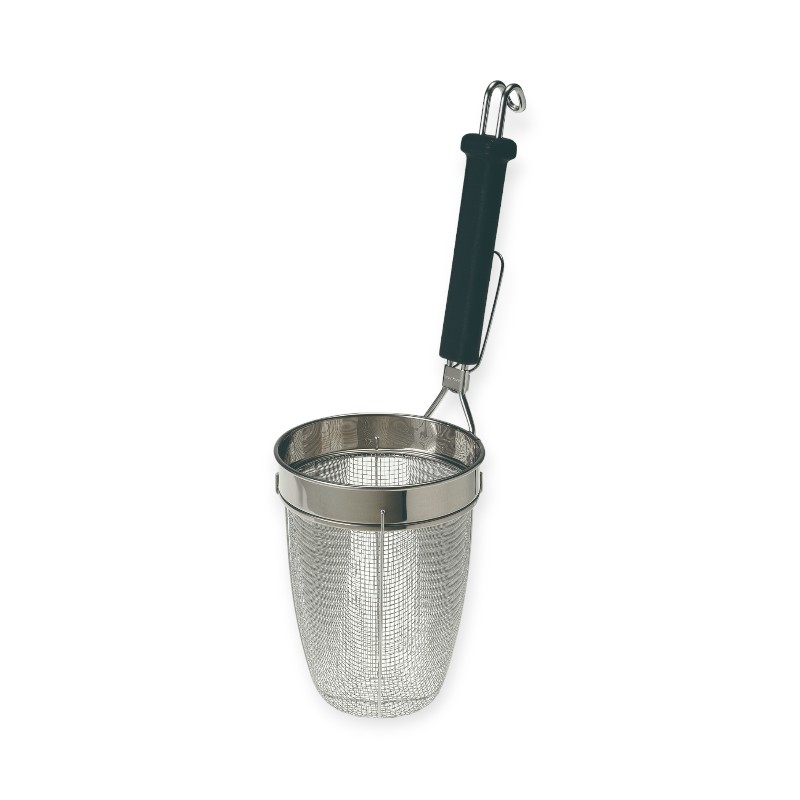 新開発のパワーグリップ!ハンドルの端がバットのグリップエンドのようになっていて、手からすっぽ抜けにくくなっています。ハンドルに付いている凹凸のシボ加工。食洗機対応、耐熱性・防カビ性に優れ、劣化しにくい樹脂ハンドルを採用。一般的なてぼで使われる3.5mmに比べ、2倍の強度を持つ5mm線を2本使用し、抜群の耐久性で4倍長持ちします。8メッシュ。