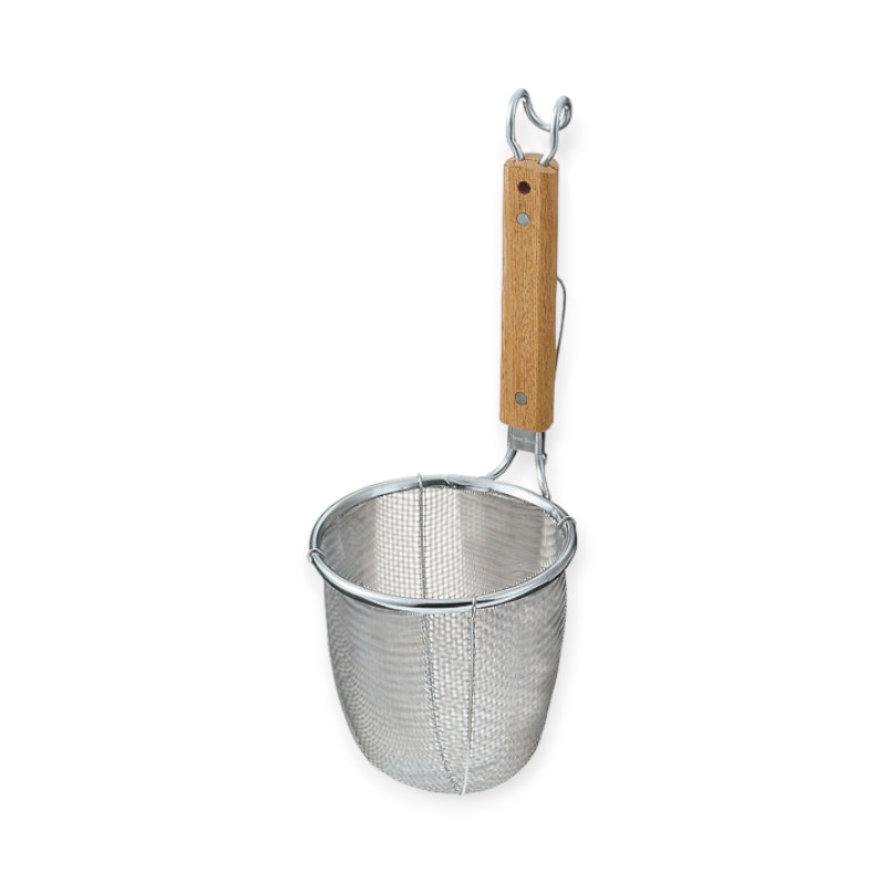 激しい湯切りに!!湯切りによる変形、破損で困っている麺職人の要望に応えたラーメン専用てぼ。太線でパワーアップ!パワーてぼ。材質:[網]18-8ステンレス、[柄]天然木品番:041119