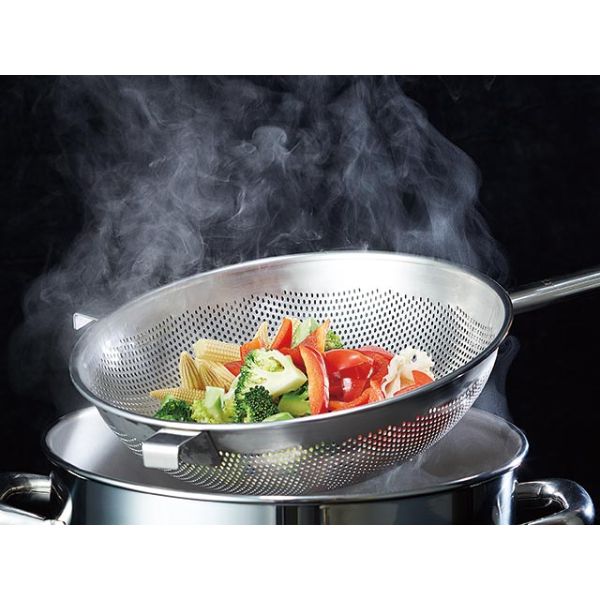 水や油などを漉すのに最適です。フック付。サイズ:直径φ270×高さ75mm、パンチング穴φ2.2mm、ハンドル22.5cm材質:18-8ステンレス直径φ270×高さ75mm、パンチング穴φ2.2mm、ハンドル22.5cm