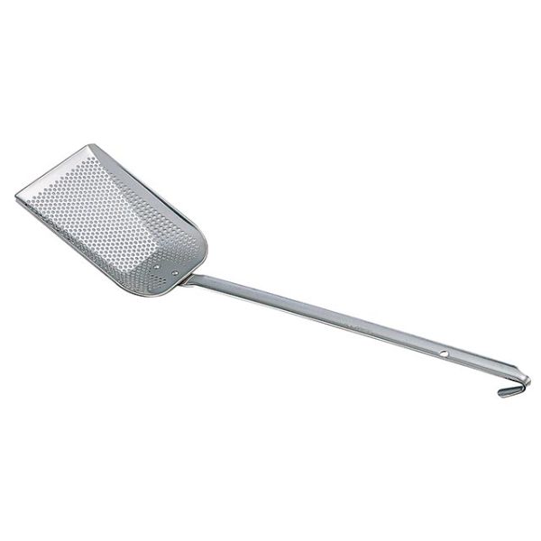 角型のかす揚げです。板ハンドル。サイズ:190×140mm、パンチング穴φ2.2mm、全長57.5cm材質:18-8ステンレス190×140mm、パンチング穴φ2.2mm、全長57.5cm
