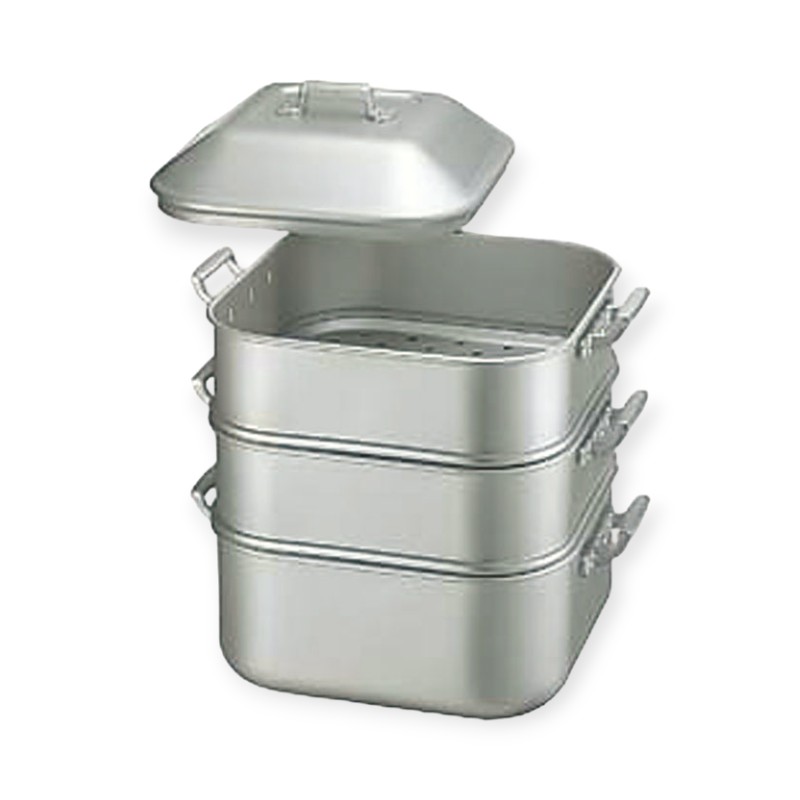 オールアルミ製の業務用ジャンボ蒸器です。アルミにアルマイト加工をほどこしていますので、臭いがつきにくくサッと洗えてお手入れが簡単※サイズは中子のサイズです。スノコ付。材質:アルミニウムにアルマイト加工品番:045028