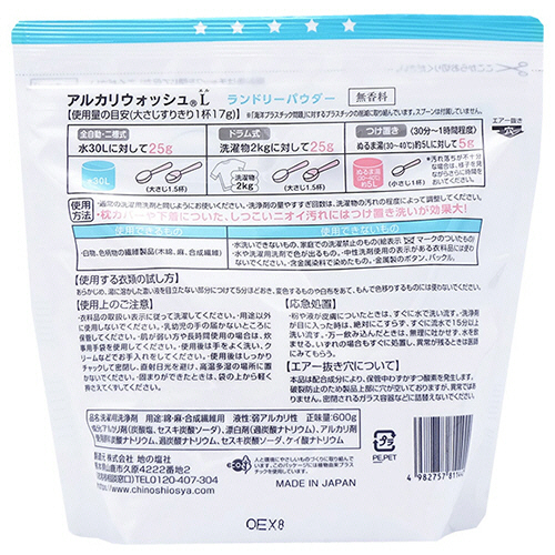 ●成分/アルカリ剤(炭酸塩、セスキ炭酸ソーダ)、漂白剤(過炭酸ナトリウム)、アルカリ剤 [使用原料]炭酸ナトリウム、過炭酸ナトリウム、セスキ炭酸ソーダ、ケイ酸ナトリウム