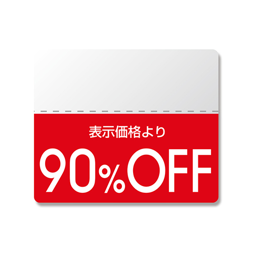 提札の下部などに貼付して使用する割引シールです。ミシン目入りの半糊タイプ。割引率10?90%に対応できる規格アイテムです。ミシン目入りなので、セール終了時や割引変更字に切り離せます。糊部分:約10mmデザイン部分:約15mm。