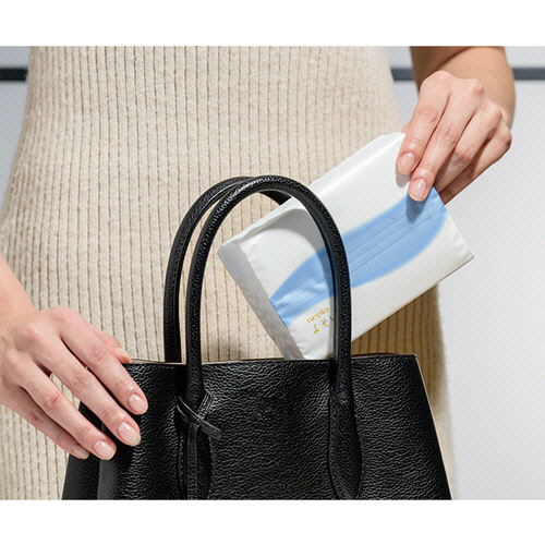 ●清潔感のある白基調の個包装デザイン。コンパクト設計を重視した小判設計個包装のミシン目。