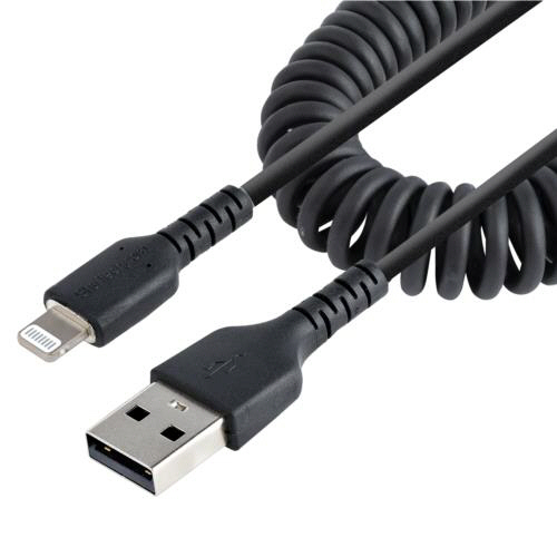 ●USB-A-Lightningケーブル。コイル型のケーブルで38cmから最大1mまで伸縮。丈夫で柔軟性のあるTPEジャケットにより、巻き取りやすく、車のコンソールボックスやグローブボックスに収納可能。