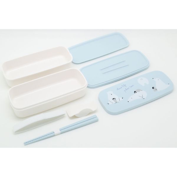アニマル柄(シロクマ)のランチシリーズ。食べ終わったらコンパクトに収納できます。フタを外して電子レンジOK。食器洗浄機・乾燥機OK。抗菌剤入り(本体上下・仕切・箸)。16.5cmの箸・仕切・ランチベルト付き。日本製。サイズ:177×76×84mm/材質:[本体・仕切り・シールフタ]PP、[フタ]AS、[箸]PMMA/重量:209g/容量:(上)340ml(下)300ml177×76×84mm