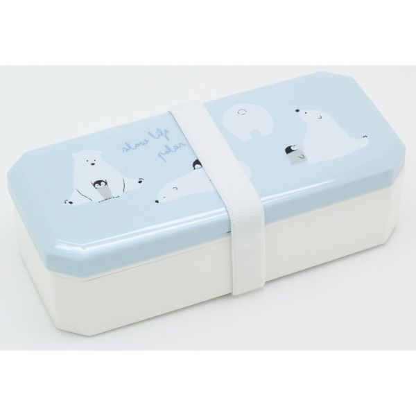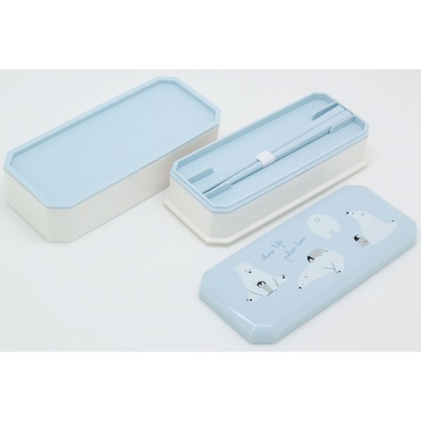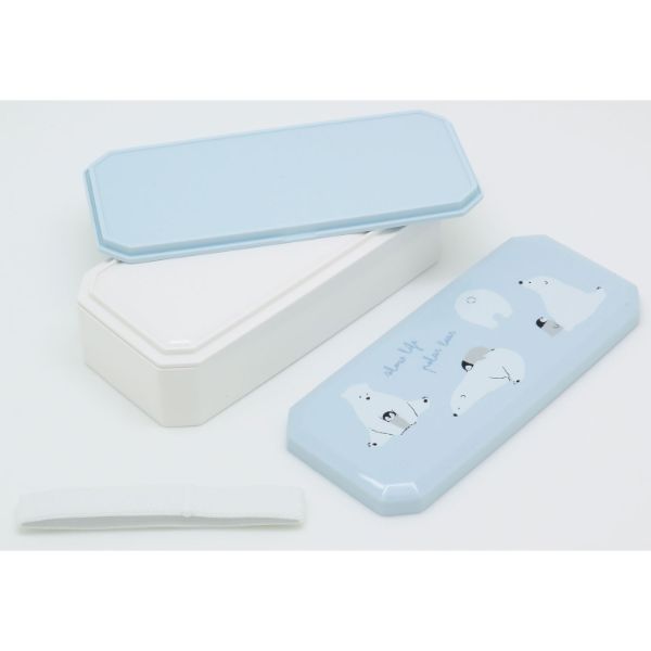 アニマル柄(シロクマ)のランチシリーズ。食べ終わったらコンパクトに収納できます。電子レンジNG。食器洗浄機・乾燥機OK。抗菌剤入り(本体上下・仕切・中子・箸)。15cmの箸・仕切・中子2個・ランチベルト付き。日本製。