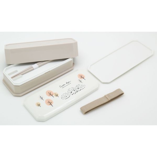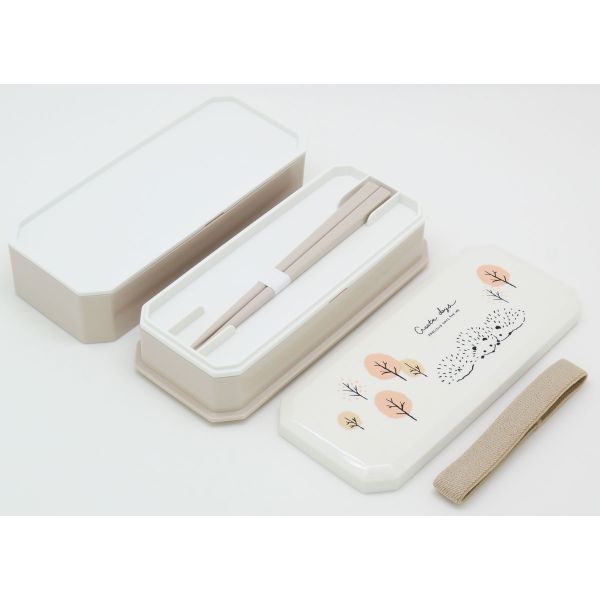 アニマル柄(ハリネズミ)のランチシリーズ。食べ終わったらコンパクトに収納できます。電子レンジNG。食器洗浄機・乾燥機OK。抗菌剤入り(本体上下・仕切・中子・箸)。15cmの箸・仕切・中子2個・ランチベルト付き。日本製。