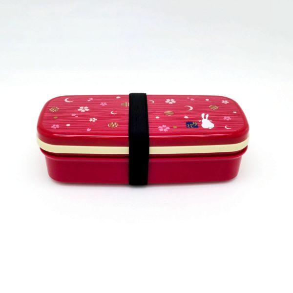 月と花とうさぎがデザインされた和柄のランチシリーズ。弁当箱と巾着袋のセットです。食べ終わったらコンパクトに収納できます。フタを外して電子レンジOK。食器洗浄機・乾燥機OK。16.5cmの箸・仕切・ランチベルト付き。防汚剤添加。日本製。