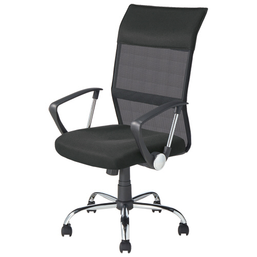 ●背もたれ上部はクッション内蔵で首アタリがやわらかいブラックのメッシュチェア。