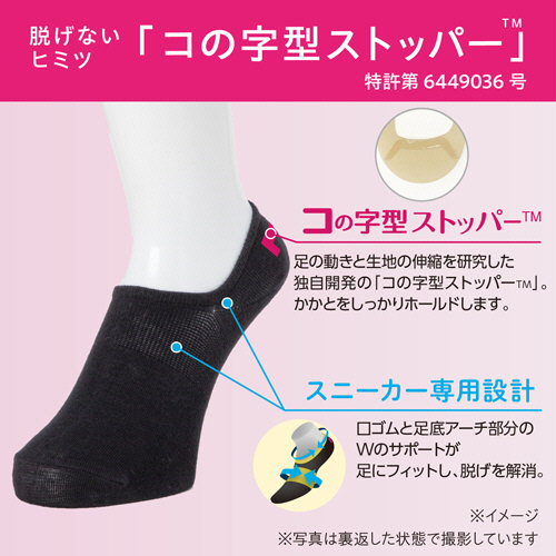 ●フットカバーの課題であった「脱げによる不快感」を、足の動きと生地の伸縮性を研究し、独自開発した「コの字型ストッパー」で対策した靴下です。